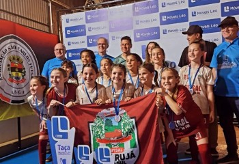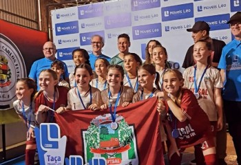 O time de futsal feminino sub-09 de Guarujá do Sul é campeão da 8ª Taça Móveis Léo de Futsal Regional Feminino, disputada neste domingo (12), em São Carlos. A conquista inédita veio em grande estilo, com vitória por 3 a 0 sobre as anfitriãs, diante de um ginásio lotado.
