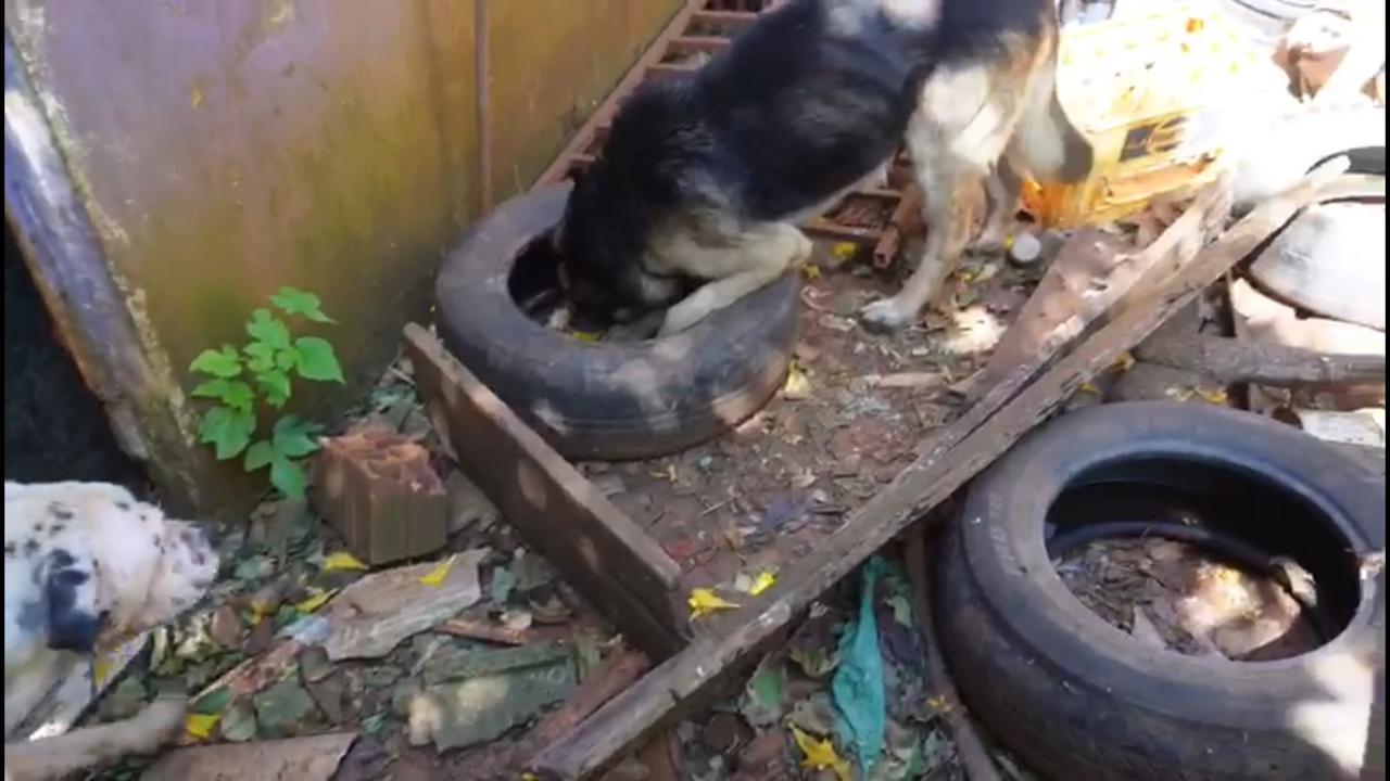 Constatou-se que não havia alimento ou água no local, e que os cães estão em situação de desnutrição, anemia, magreza extrema e infestados de carrapato e pulga.