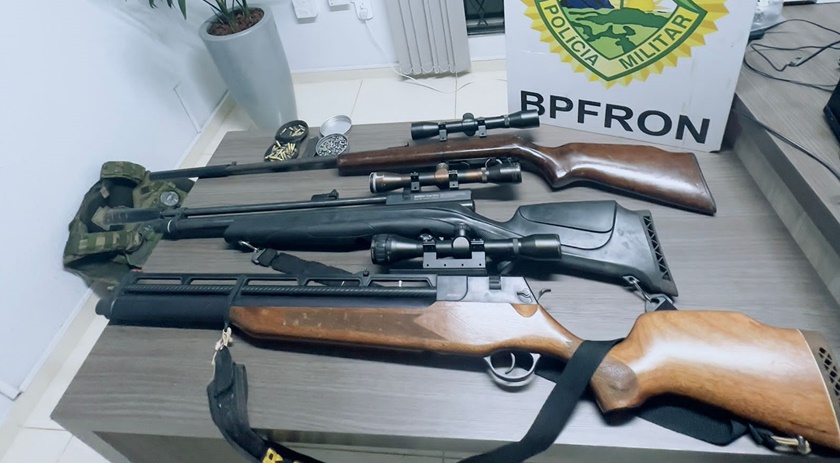 No interior do veículo os policiais encontraram uma arma de fogo, tipo rifle, marca CBC modelo 122, calibre .22mm, com 44 munições intactas e 01 deflagrada, além de mais 02 espingardas de pressão, calibre 5.55mm, todas equipadas com lunetas.