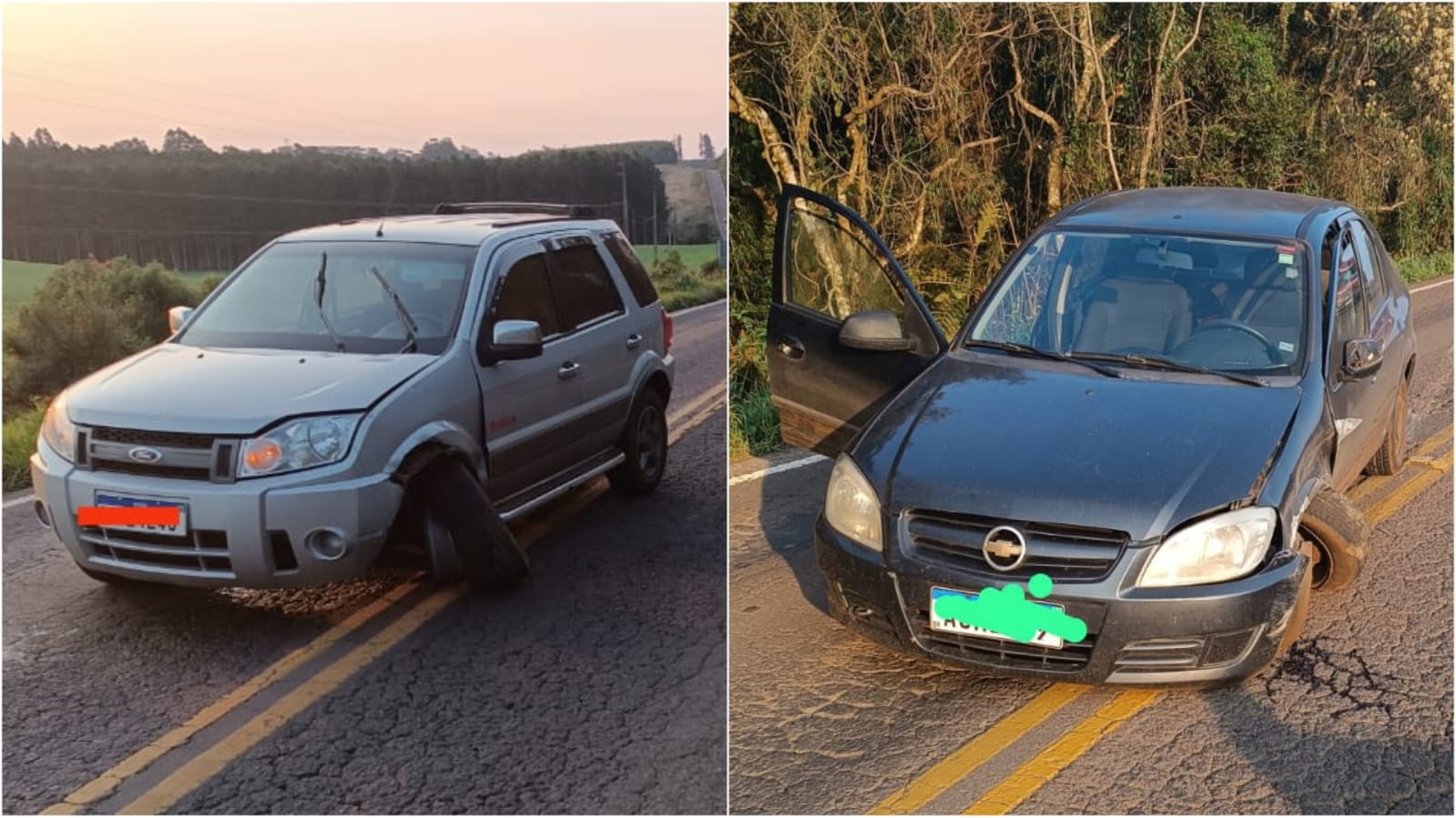 Ao chegarem ao local, os agentes encontraram o veículo Prisma, que viajava no sentido Palma Sola para Flor da Serra-PR, e o veículo do tipo EcoSport, que transitava no sentido contrário, de Flor da Serra-PR para Palma Sola. Ambos os veículos apresentavam danos materiais como resultado da colisão.