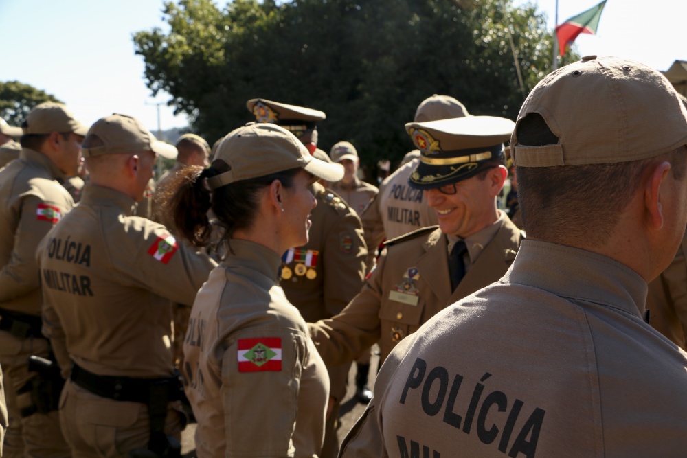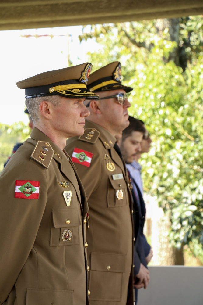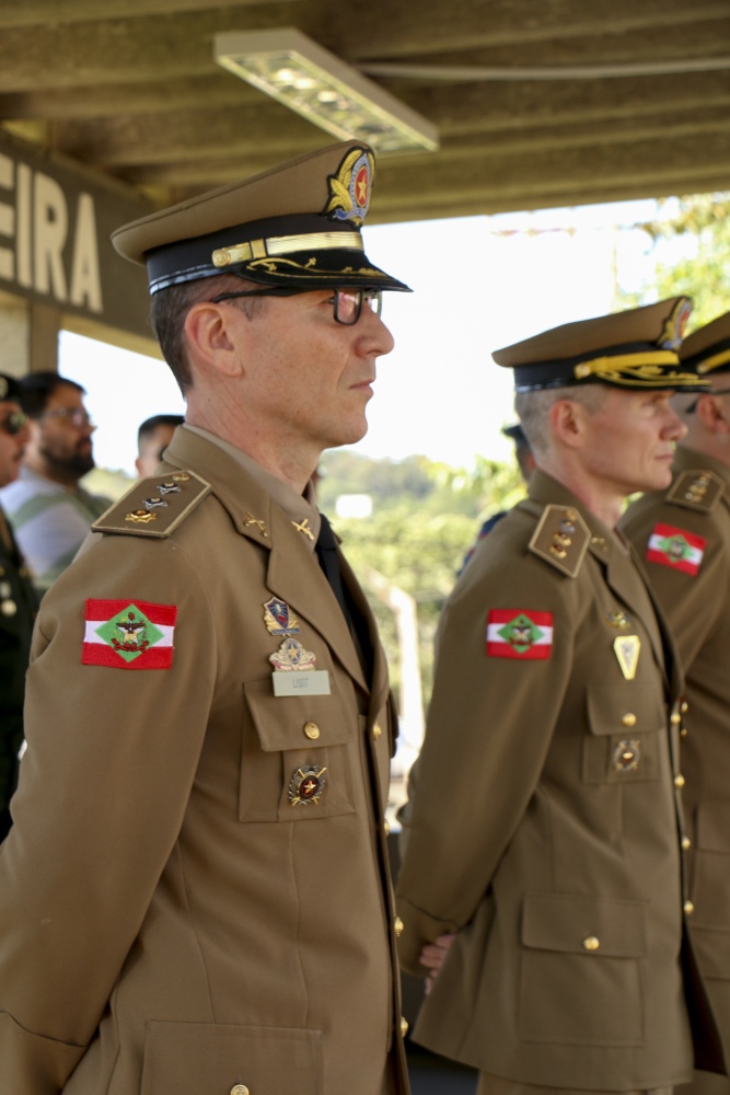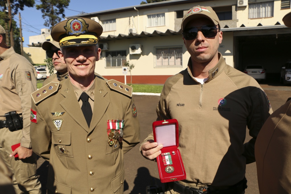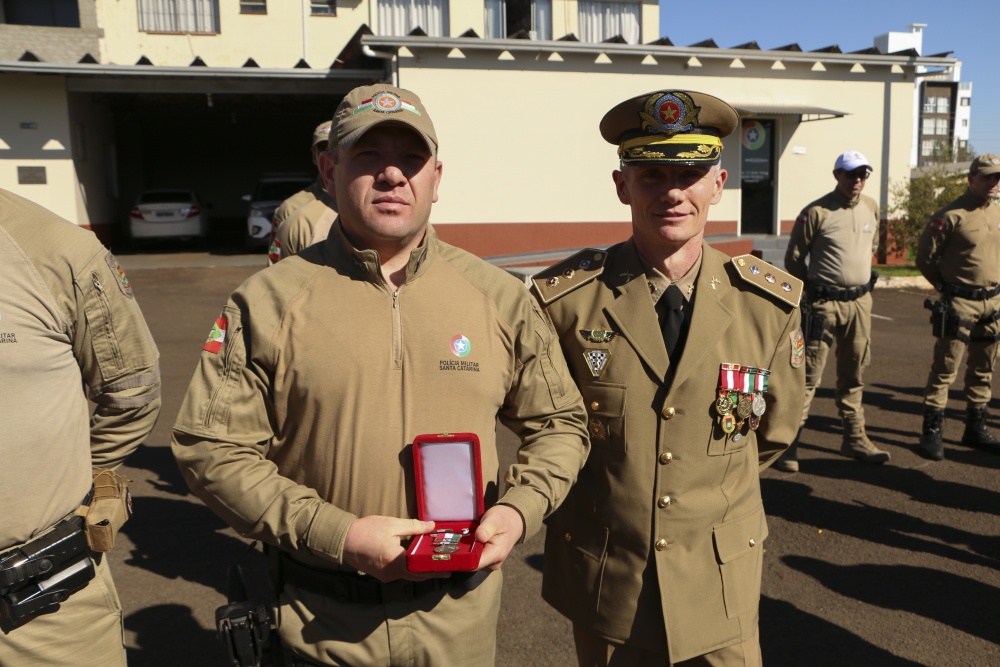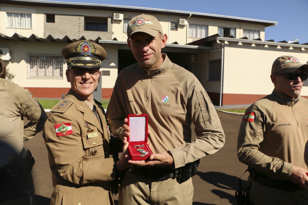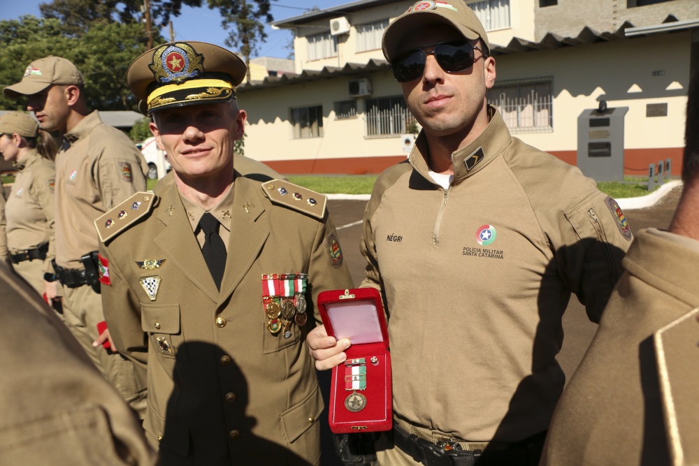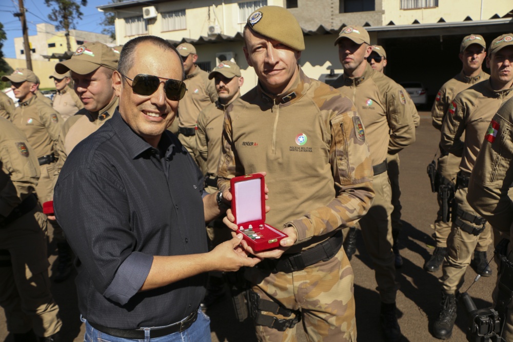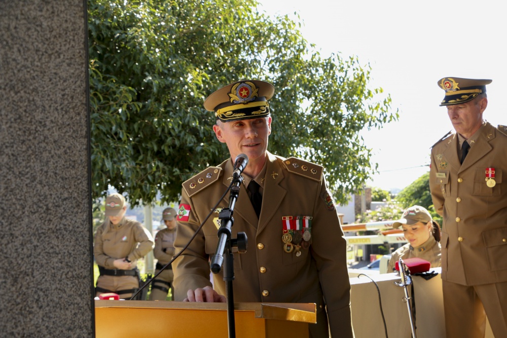 Encerrando a Solenidade, fez o uso da palavra o Tenente-Coronel Fábio Jose Hoelscher, representando no ato o Comandante do 9º Comando Regional de Polícia Militar de Fronteira, o qual destacou a importância desta data para a Polícia Militar de Santa Catarina, que no dia 5 de maio completou seus 189 Anos, parabenizou os agraciados e desejou sucesso na carreira aos policias militares promovidos.