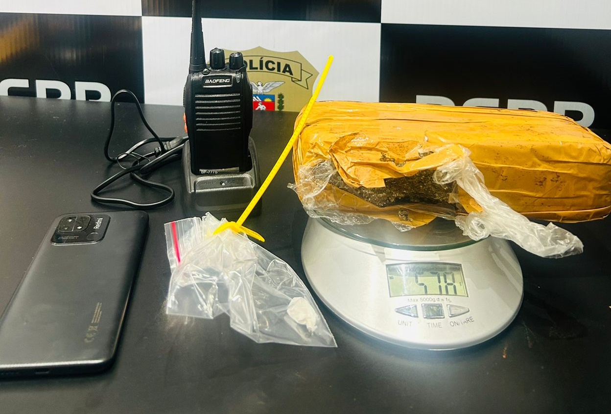Na operação, foi apreendido em sua posse um tablete de substância análoga à maconha que, pesado, totalizou 580g, uma bucha de cocaína, um rádio comunicador e um aparelho celular.