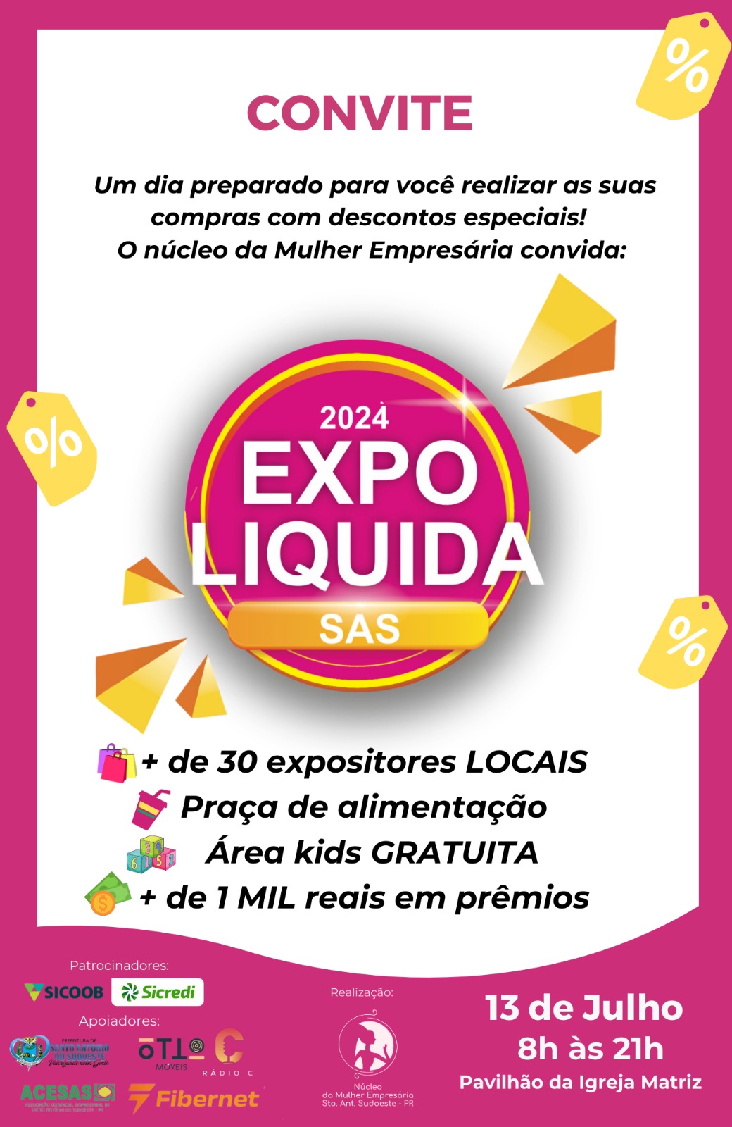 Neste sábado, dia 13 de julho, o Núcleo da Mulher Empresária de Santo Antonio do Sudoeste promoverá a segunda edição da Expolíquida. O evento reunirá diversos empresários do município, oferecendo um mix de moda, gastronomia, diversão e muito mais.