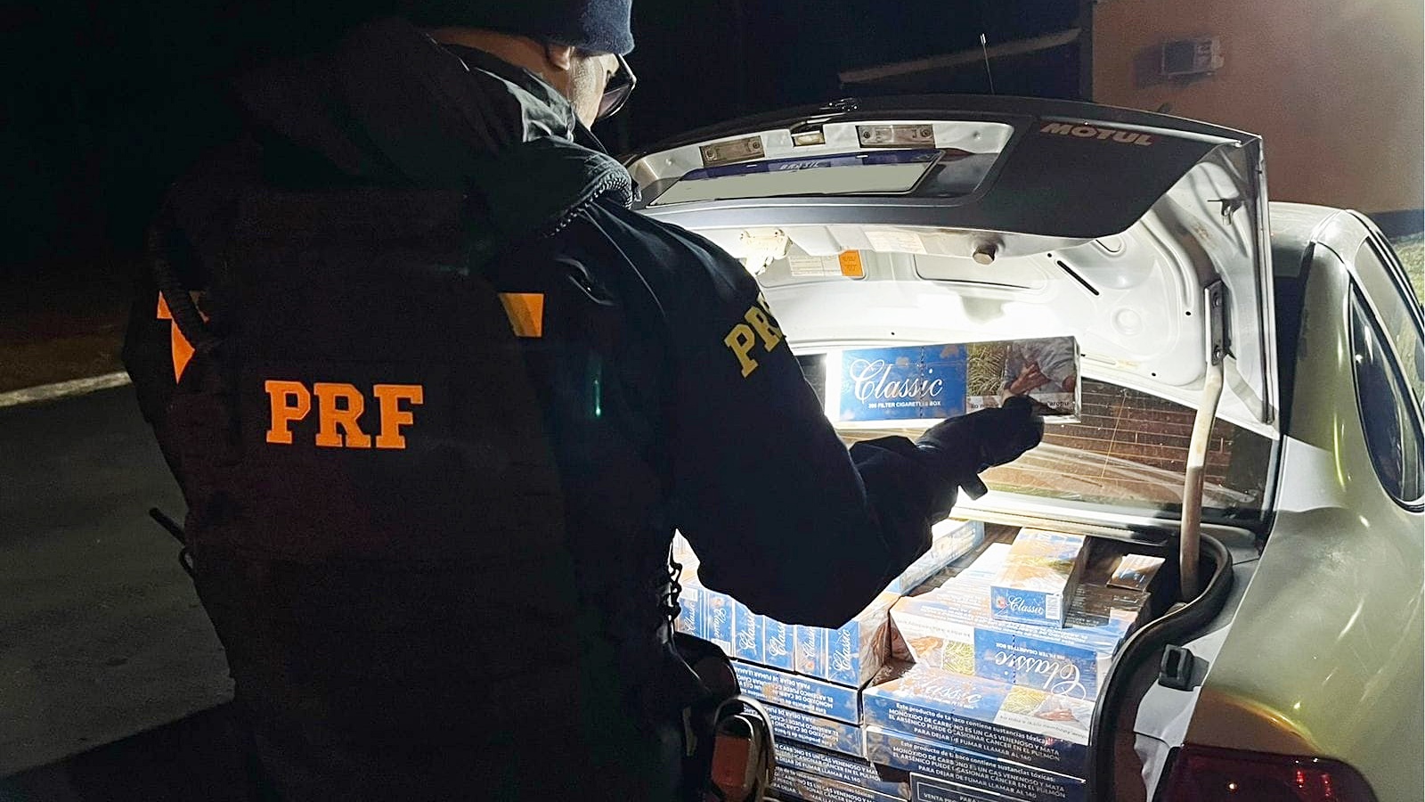 Foram encontrados cerca de 5.000 maços de cigarros de origem estrangeira, das marcas Palermo e Classic, no porta malas, banco traseiro e banco dianteiro do veículo.