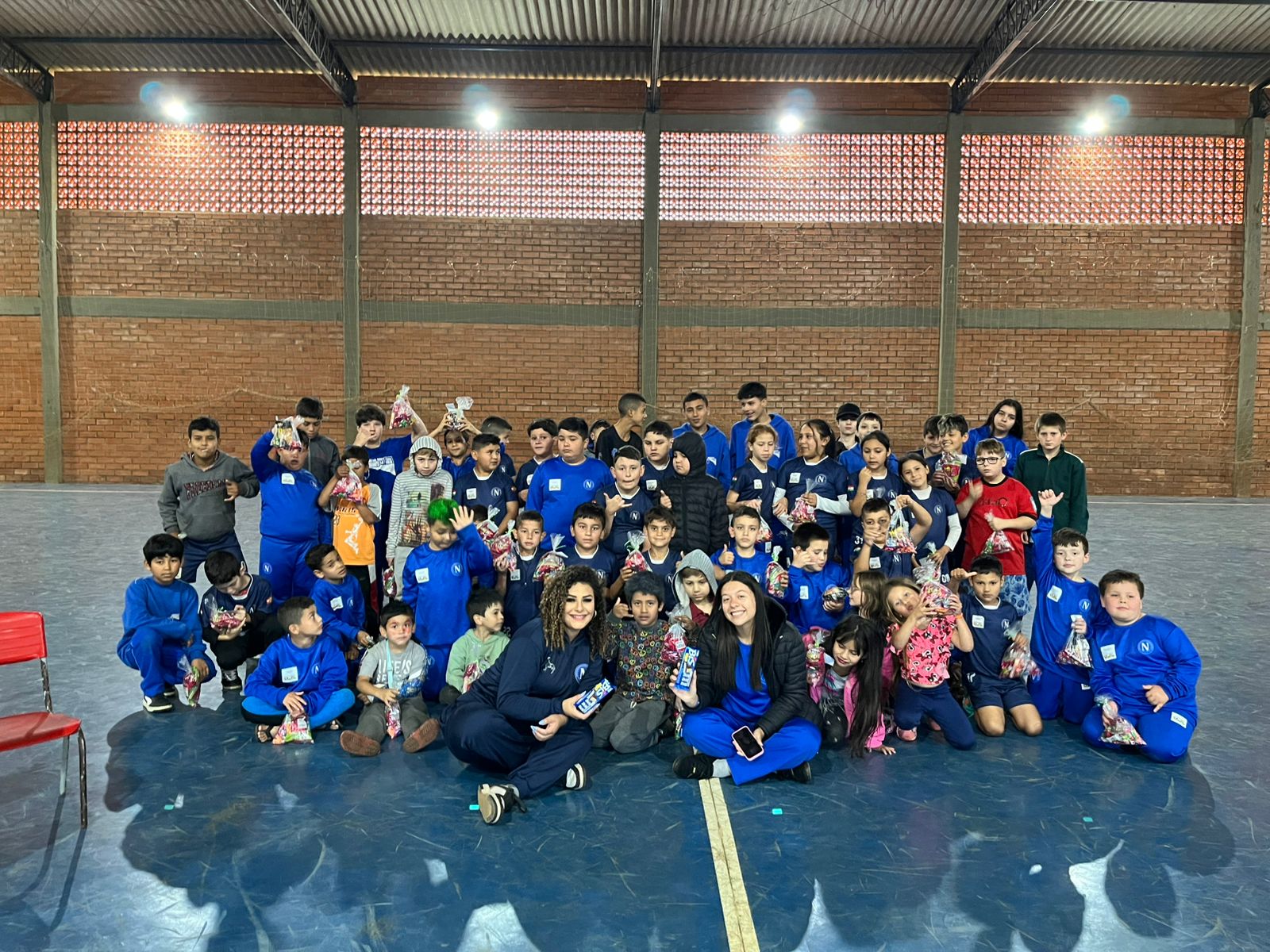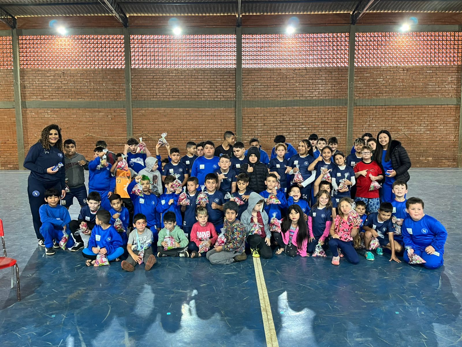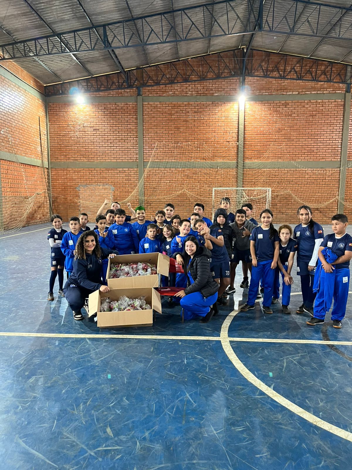 A Associação Nacional realizou no dia de ontem a distribuição de cestas e doces para 80 crianças matriculadas e que estão participando do projeto da escolinha de futsal na comunidade.