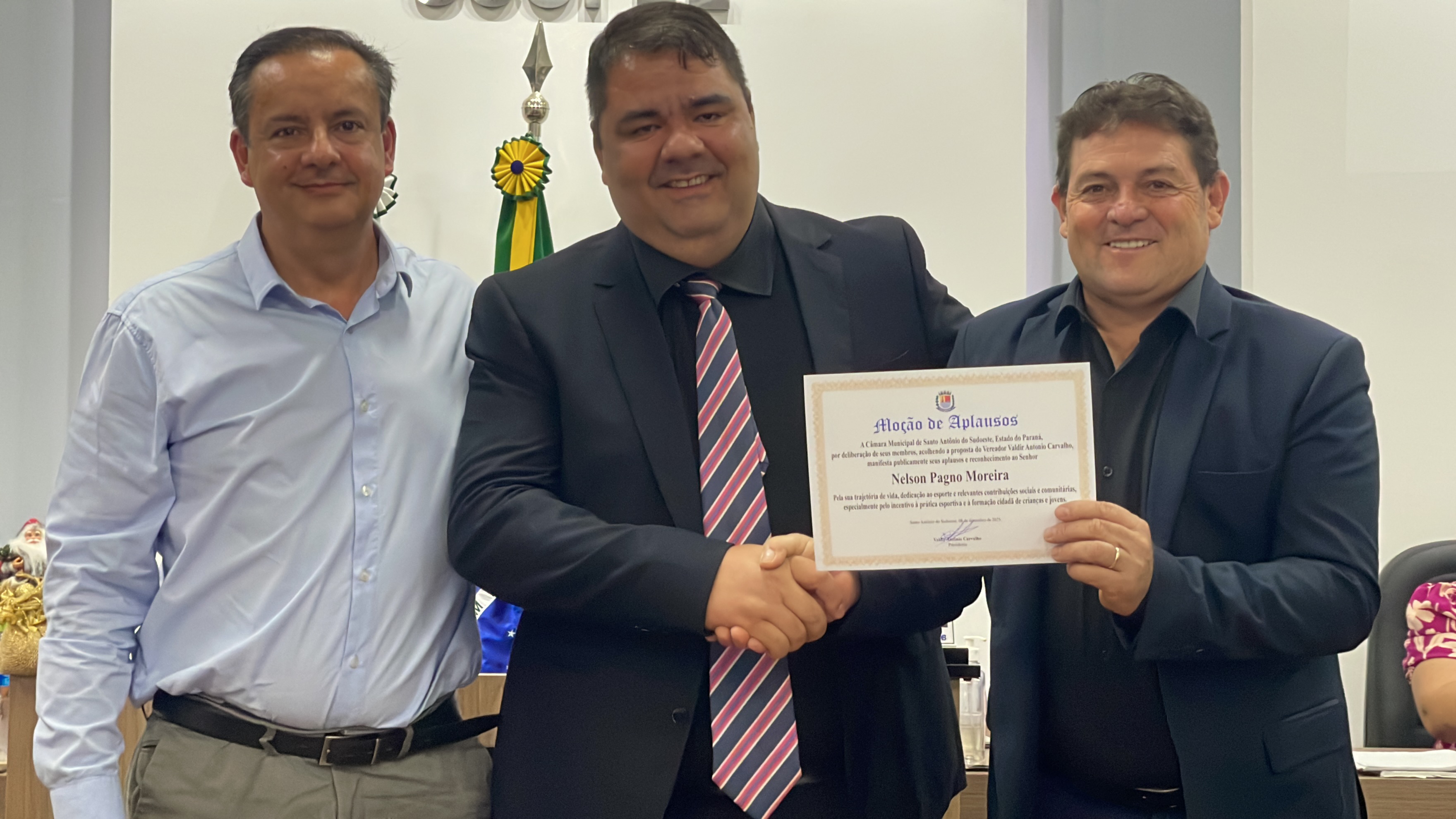 Nelson Pagnao Moreira, carinhosamente conhecido como Bugrão, empresário e gestor do Grupo Briolimp, foi homenageado pela Câmara de Vereadores de Santo Antonio do Sudoeste com uma moção de aplausos. O reconhecimento destaca o trabalho desenvolvido em prol de projetos sociais, área em que o Grupo Briolimp já patrocina mais de 100 iniciativas.