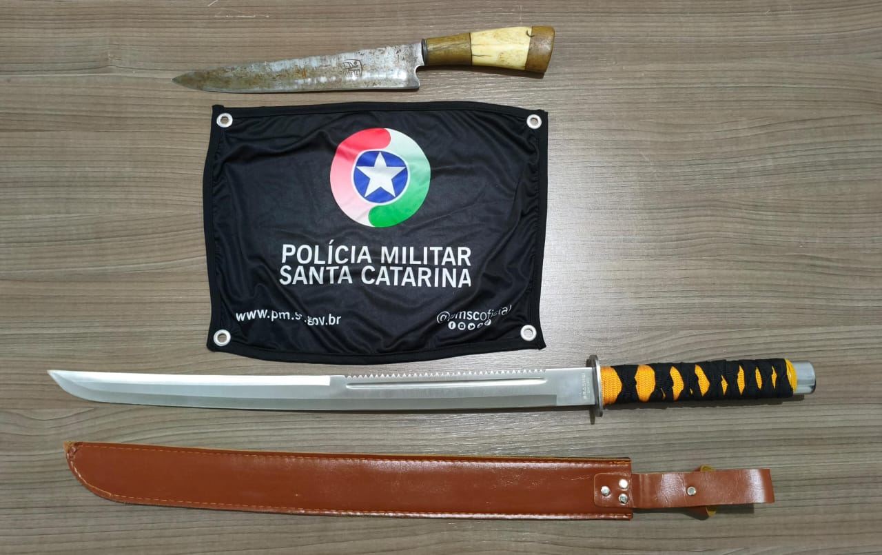 Também na noite de sábado (4), a guarnição foi acionada para averiguar denúncia de arma de fogo em um bar na Rua Goiás, bairro Melo. Nenhuma arma de fogo foi localizada, porém um homem em visível estado de embriaguez foi flagrado com uma faca presa à cintura e, em um veículo próximo, foi encontrada uma espada do tipo katana. As armas brancas foram apreendidas e foi lavrado Termo Circunstanciado.
