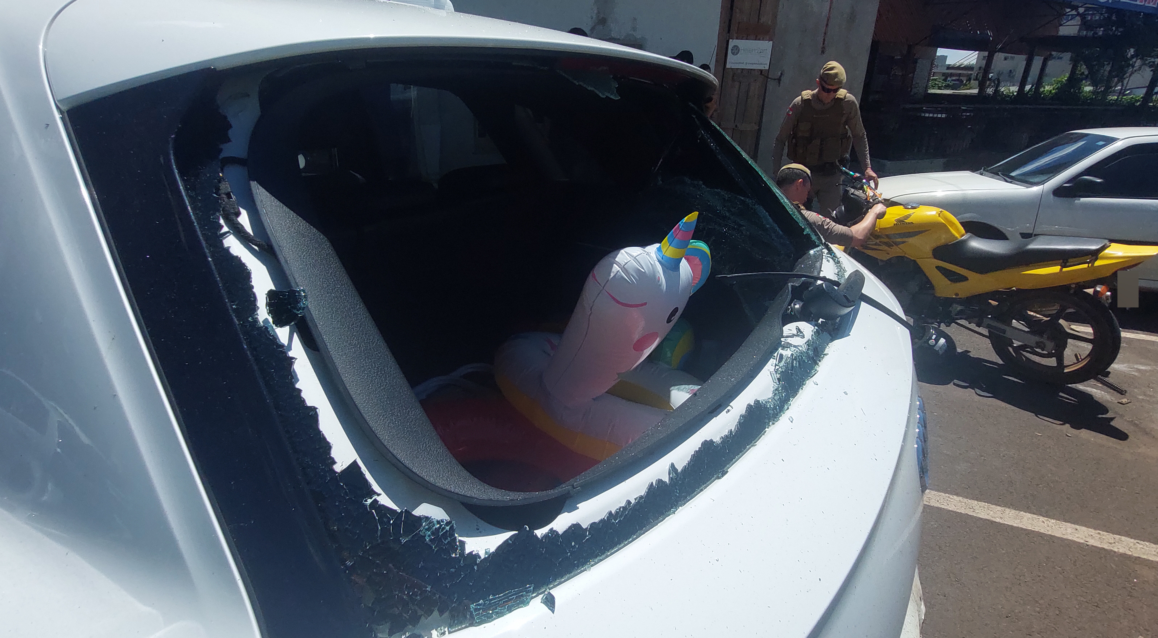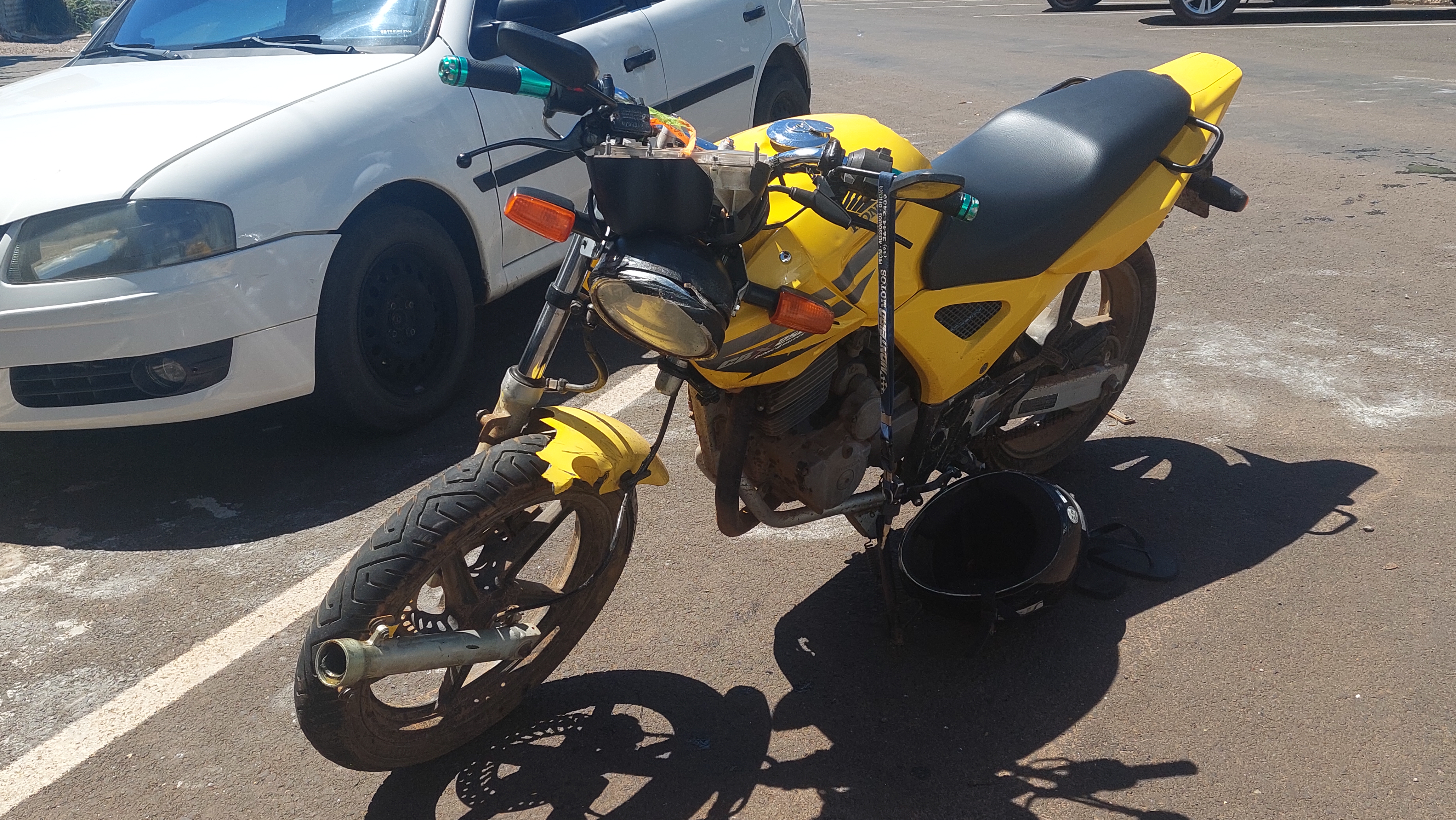 Com a força do impacto, a motocicleta sofreu grandes avarias na parte frontal, enquanto o veículo teve o vidro traseiro quebrado e o para-choque danificado.
