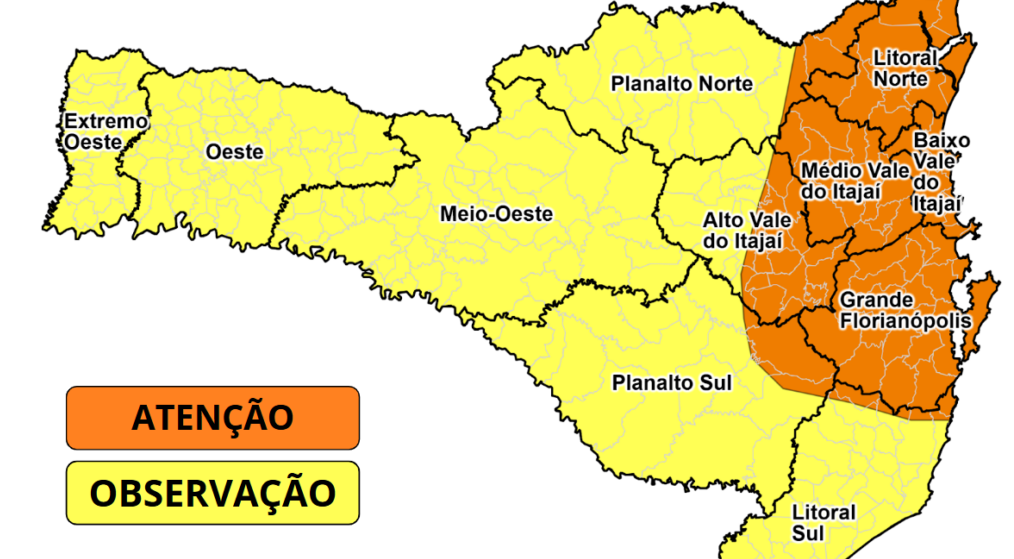 No sábado (7), o dia ainda começa abafado, com temperaturas próximas ou acima dos 30°C, especialmente no Oeste e no Litoral Norte. A partir do fim da manhã e início da tarde, o avanço do sistema frontal provoca aumento da nebulosidade e ocorrência de chuva. O risco é alto para temporais com chuva intensa entre a Grande Florianópolis, Vale do Itajaí e Litoral Norte, e moderado nas demais regiões do estado.