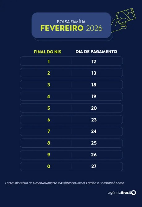 No modelo tradicional do Bolsa Família, o pagamento ocorre nos últimos dez dias úteis de cada mês. Por causa do carnaval, os beneficiários de NIS de fim 1 e 2 receberam na segunda semana de fevereiro, com os depósitos sendo retomados nesta quarta.