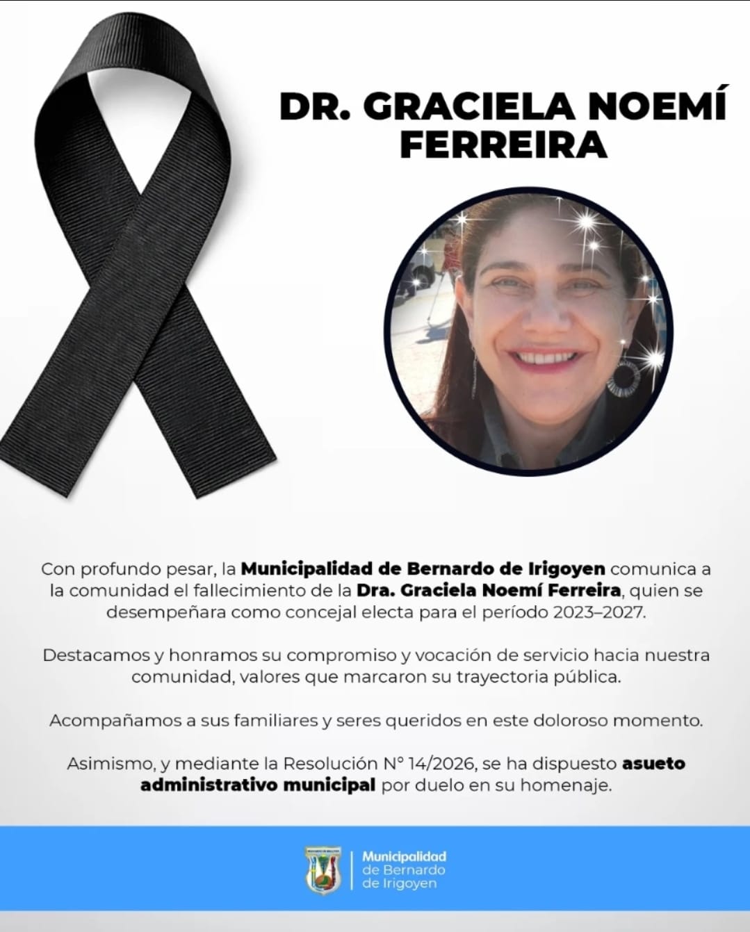 A Municipalidad de Bernardo de Irigoyen comunicou oficialmente o falecimento da Dra. Graciela Noemí Ferreira, que atuava como conselheira eleita para o período de 2023 a 2027.