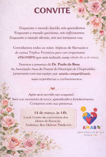 O município de Barracão será palco neste sábado de um encontro especial voltado às mães atípicas de toda a região da Tríplice Fronteira. O evento é promovido pela AMAB – Associação Mães Atípicas de Barracão e tem como objetivo proporcionar um momento de acolhimento, troca de experiências e fortalecimento entre famílias que convivem com o autismo e outras condições que exigem atenção especial.