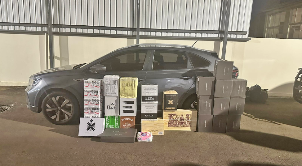 Na vistoria, foram encontradas mais de 130 garrafas de vinho de origem estrangeira, também acima da cota permitida e sem o devido desembaraço aduaneiro. Os ocupantes, ambos oriundos de Lages, relataram que haviam ido até a Argentina para adquirir a mercadoria e que já haviam realizado a prática anteriormente.
