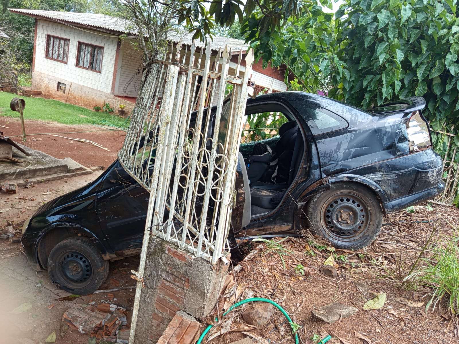 Com o impacto, o automóvel saiu da pista e parou sobre a cerca de uma residência. O acidente resultou em danos materiais em ambos os veículos.
