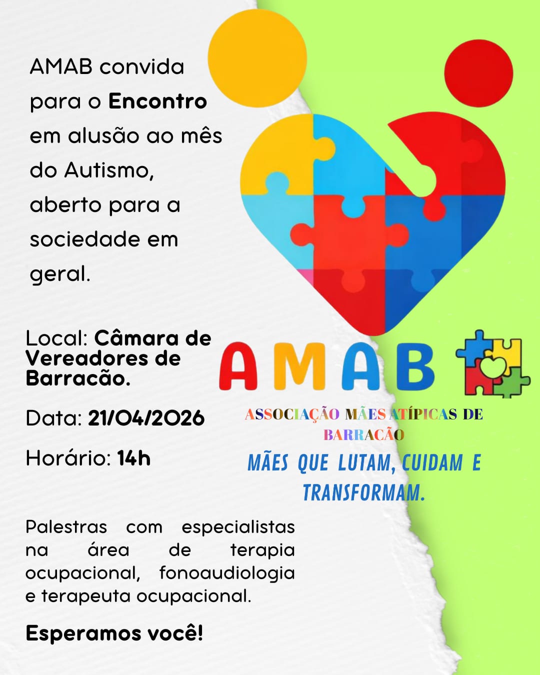 A AMAB promove no próximo dia 21 de abril um encontro especial em alusão ao mês de conscientização do autismo. O evento será realizado na Câmara de Vereadores de Barracão, a partir das 14h, e é aberto à comunidade em geral.