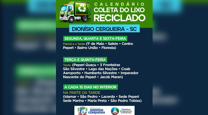 A Prefeitura de Dionísio Cerqueira divulgou o calendário atualizado da coleta de lixo reciclado no município. O cronograma estabelece dias e períodos específicos para o recolhimento, com o objetivo de melhorar a organização do serviço e incentivar a separação correta dos resíduos.