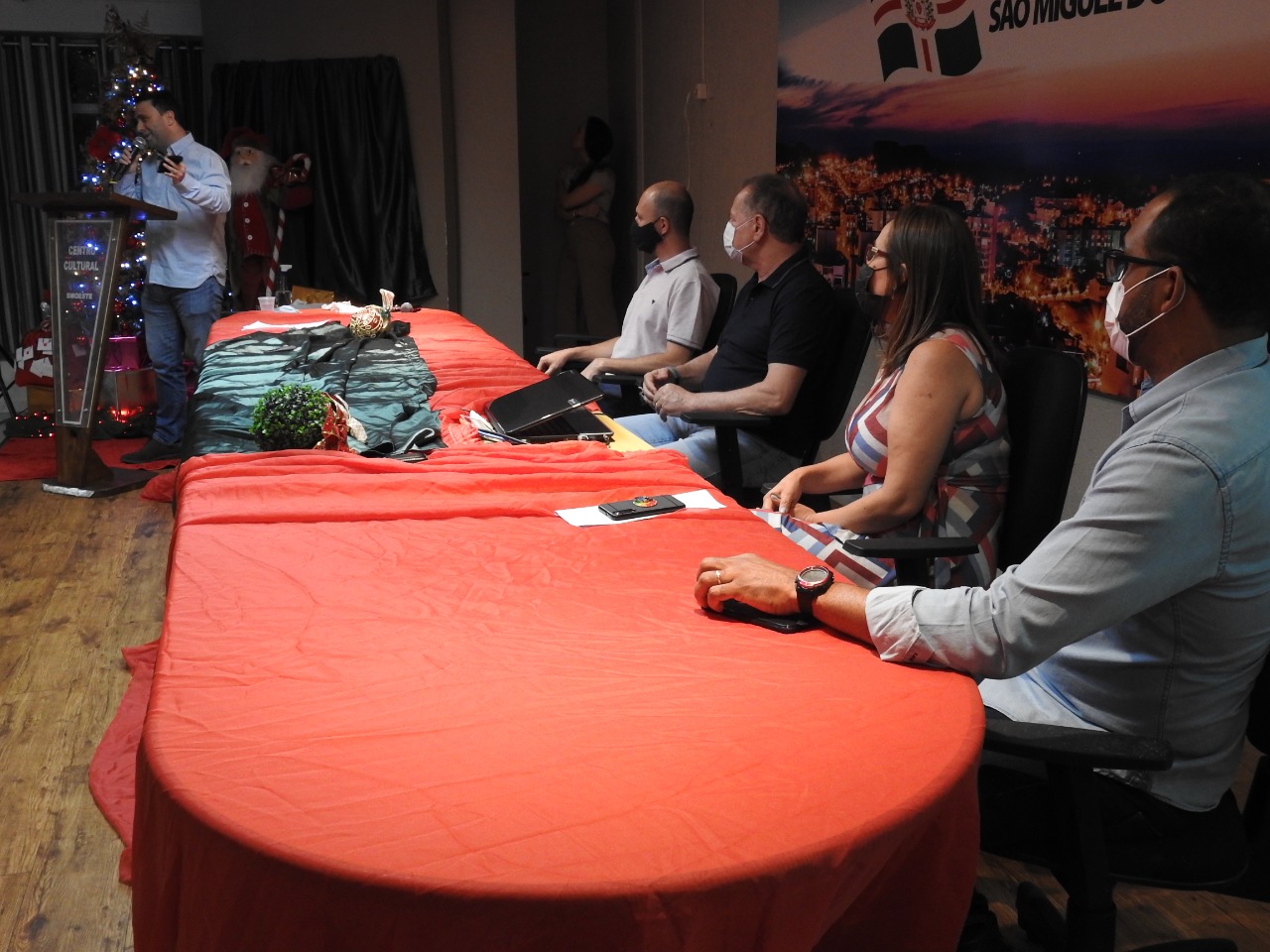A Administração Municipal de São Miguel do Oeste, por meio da Secretaria de Esporte e Cultura, em parceria com a CDL e Acismo, apresentou na tarde desta quinta-feira (25), no Salão Nobre da Prefeitura, a programação do “Natal Regional 2021 – Tempo de Renovação”. O ato contou com a presença da organização, patrocinadores, secretários municipais, vereadores e imprensa.