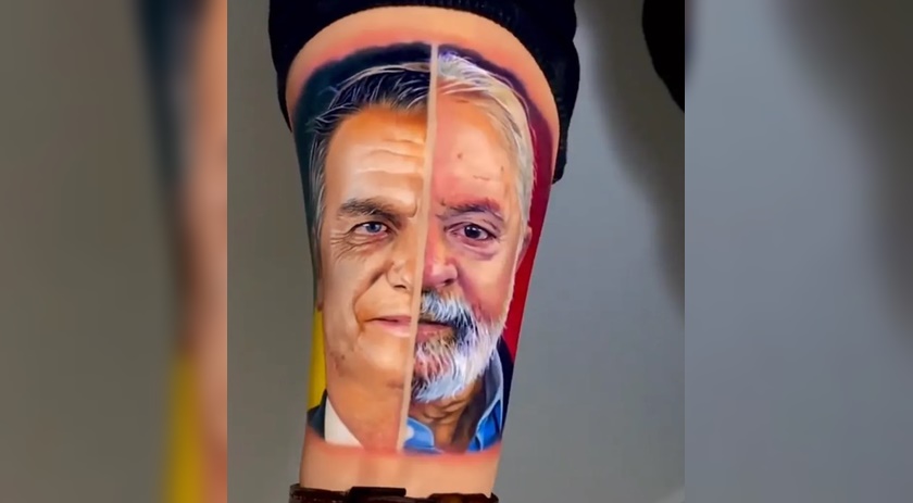 Um morador da cidade de São Paulo fez uma tatuagem com os rostos do ex-presidente Lula (PT) e do atual presidente Jair Bolsonaro (PL), na tarde de quinta-feira (15), na Zona Leste da capital. O homem, que não quis ser identificado, passou por uma sessão de mais de 11 horas para unir os dois adversários nas eleições presidenciais de 2022.