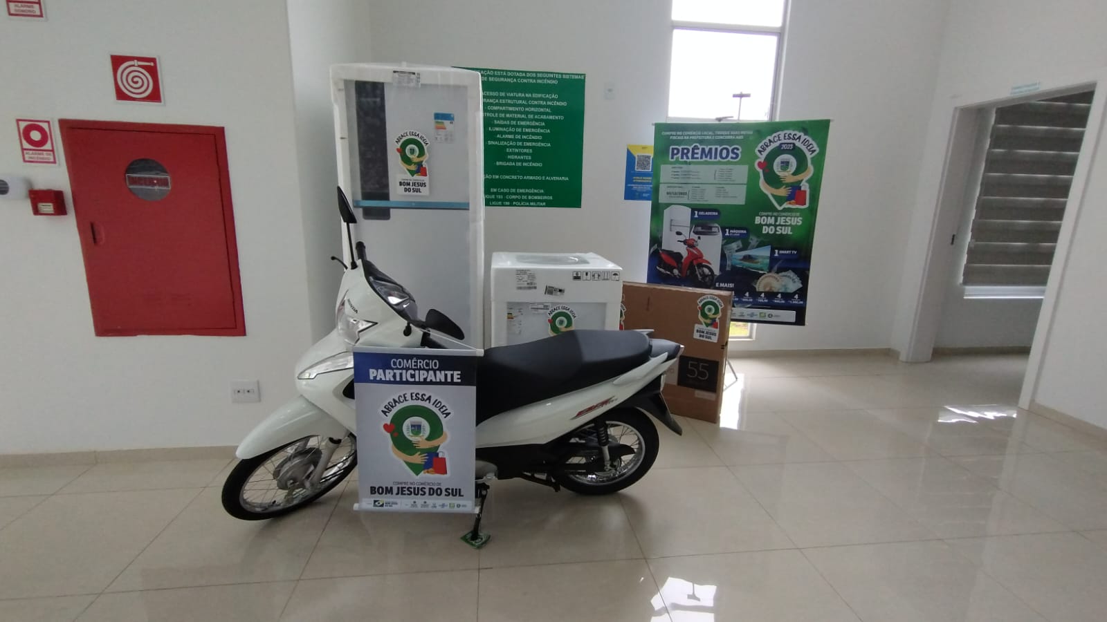 A cada sorteio da Campanha Abrace Essa Ideia, vem tomando mais corpo e mais atenção por moradores de Bom Jesus do Sul, com prêmios atrativos e sorteios em dinheiro, a Administração Municipal, junto com a Secretaria de Indústria e Comércio, já adquiriu os prêmios do último sorteio do ano, entre eles: Geladeira, televisão, máquina de lavar roupa e uma Honda Biz 0KM.