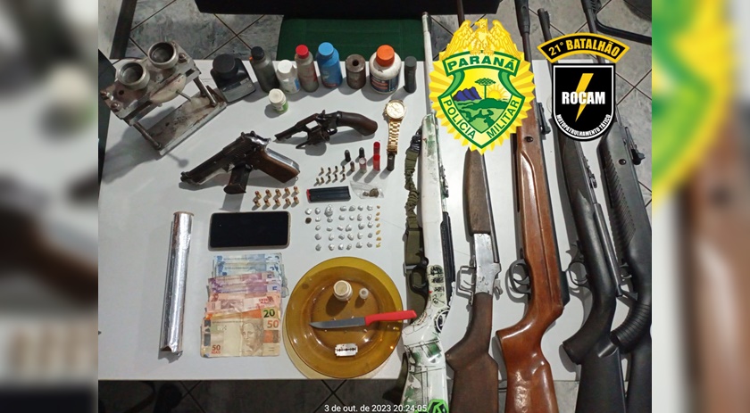 Na sequência em uma casa foram localizadas sete armas de fogo, uma pistola, um revólver, e cinco espingardas calibres 22, e 32 e ainda objetos para recarga de cartuchos.