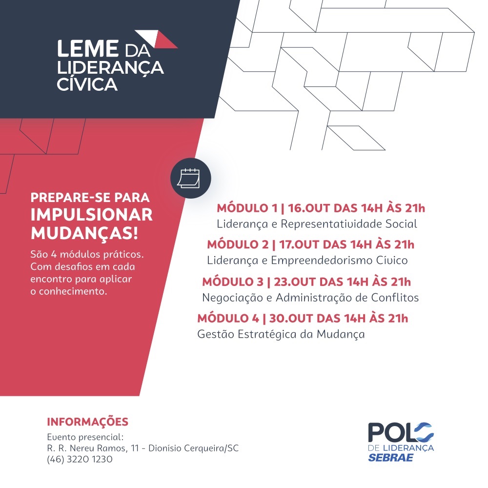 “Trataremos sobre o que é ser um líder cívico, um líder voltado para o empreendedorismo, um líder na administração de conflitos e um líder com estratégias de mudanças”.