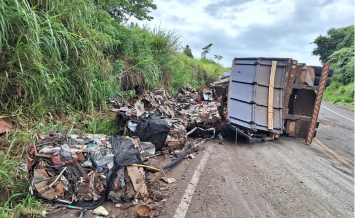 Na manhã desta quinta-feira (28), uma carreta placas do Paraguai carregada de sucata tombou e causou a interdição parcial da SC-161, em Romelândia, próximo aos dois trevos da cidade. O acidente foi registrado por volta das 11h.