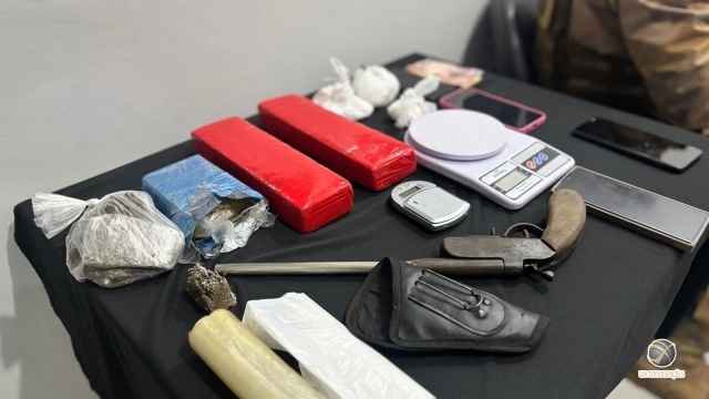 No local, a PM encontrou e apreendeu cerca de 2 kg de maconha, mais 150 gramas de cocaína, duas balanças de precisão, diversos celulares, uma pequena quantia em dinheiro e uma arma de fogo, tipo Garrucha, calibre 36.
