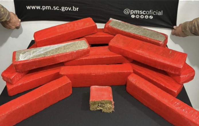 Em uma abordagem a um ônibus, o cão policial indicou inconformidade em uma bagagem no maleiro. Ao verificar manualmente, foram encontradas diversas embalagens, totalizando 15 kg de maconha.