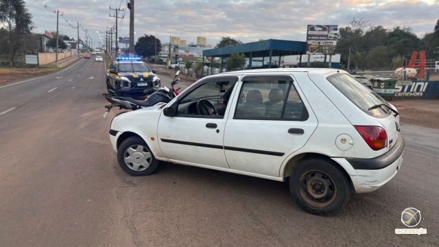 Acidente na Avenida Willy Barth ocorreu após tentativa de conversão e ultrapassagem, deixando o motociclista com ferimentos leves. A condutora do Fiesta foi autuada por não possuir habilitação brasileira.