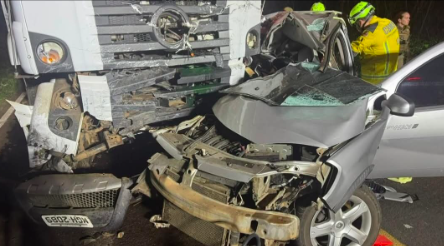 Uma colisão entre um carro e um caminhão deixou uma mulher morta no início da noite desta terça-feira, dia 8, na SC-283, em Guatambu, no Oeste catarinense.