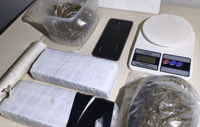 Com o condutor foi localizada uma porção de maconha que pesou 61 gramas. Posteriormente em sua casa foram localizados dois tabletes de maconha e algumas porções que após pesados totalizaram 1,635 kg da droga, além de uma balança de precisão e plástico filme para embalar a droga.