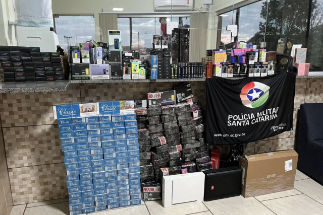Operação da Polícia Militar na SC-155 abordou veículo com destino a Santa Maria (RS) e encontrou cigarros eletrônicos, cigarros convencionais e eletrônicos do Paraguai em excesso de cota.