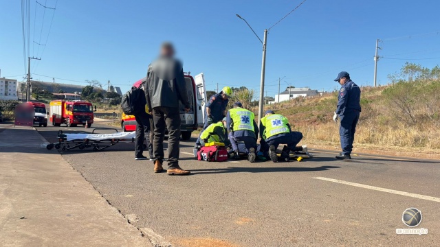 Equipes do Corpo de Bombeiros e do SAMU foram acionadas para atender a ocorrência. Ao chegarem ao local, encontraram a condutora de uma Honda Biz deitada ao solo. Ela estava consciente e orientada, mas relatava dores intensas na região das pernas.