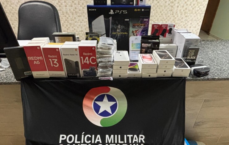 Ao realizar a vistoria no automóvel, a guarnição encontrou, no assoalho abaixo do assento do condutor, alguns smartphones. Já no porta-malas do veículo, a equipe encontrou algumas sacolas com tapete, roupas de cama, Playstation 5, skate elétrico, perfume e itens de informática.