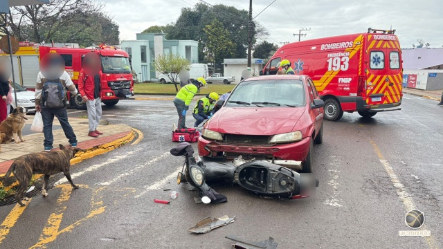 Acidente ocorreu no cruzamento das ruas Elizabeth e Itaberaba. Vítimas da motocicleta foram levadas ao Hospital Regional Terezinha Gaio Basso.