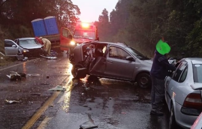 Um acidente envolvendo dois caminhões e quatro veículos e dois caminhões na manhã desta quinta-feira (24), em Dois Vizinhos. A colisão aconteceu por volta das 6h50 na rodovia PR-281, no trecho que liga o município ao trevo do Alto Bela Vista.