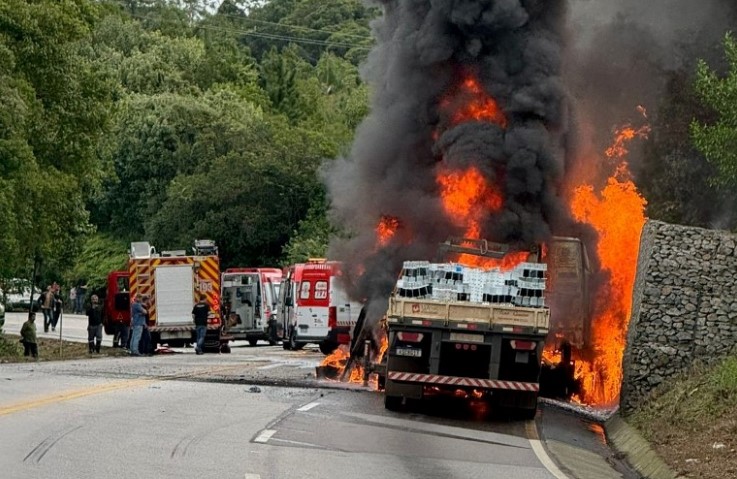 O veículo pegou fogo na ocorrência (veja o vídeo logo abaixo), registrada na altura do distrito de Caldas da Imperatriz. Conforme o Corpo de Bombeiros, o acidente também envolveu outros cinco veículos — quatro de passeio e uma carreta.