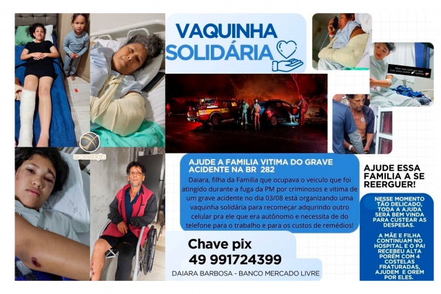 A família de São Miguel do Oeste envolvida no grave acidente de trânsito ocorrido no último domingo (03) na BR-282 em Iraceminha está buscando ajuda para o tratamento médico e para recomeçar a vida. O carro onde estavam, um Renault Scenic, com placas de São José do Cedro, foi atingido de frente por um Fiat Punto ocupado por criminosos que fugiam da polícia após um sequestro.