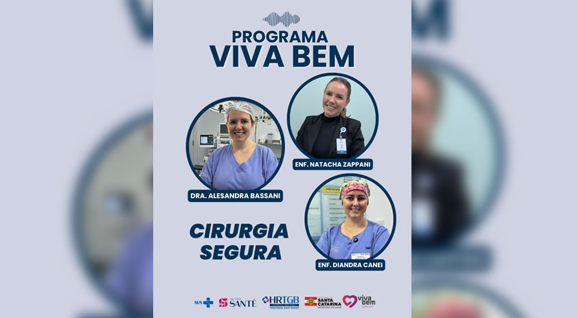 No Programa Viva Bem de hoje, a gerente de Enfermagem do Centro Cirúrgico, Natacha Zappani, a enfermeira Diandra Canei e a cirurgiã Alesandra Bassani apresentam dados do setor, os protocolos de cirurgia segura e também orientações importantes a todos que venham a realizar procedimento cirúrgicos no HRTG-Santé.