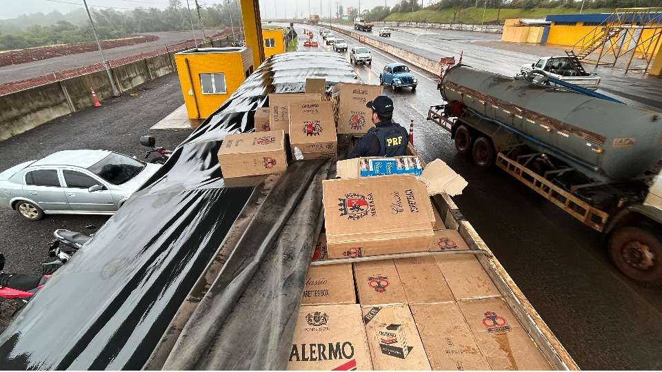 Ao abrir a lona, foi verificado que a parte superior da carga estava coberta por caixas de cigarro oriundas do Paraguai que entraram irregularmente no território brasileiro.