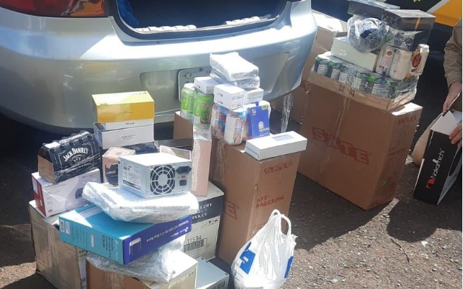 Durante a abordagem a um veículo GM/Prisma, os policiais encontraram diversos celulares, eletrônicos, cosméticos e bebidas sem a devida documentação aduaneira. Todo o material foi apreendido e encaminhado à Receita Federal, configurando o crime de descaminho.