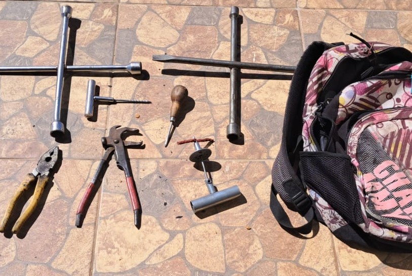 Na busca pessoal, nada de ilícito foi encontrado, e não havia registros contra ele nos sistemas disponíveis à equipe. Porém, ao verificar o conteúdo da mochila, foram localizadas diversas ferramentas: duas chaves de roda, dois alicates e três chaves usadas para conserto de pneus.