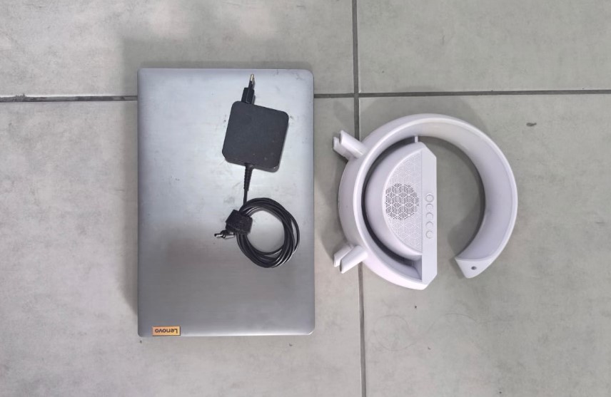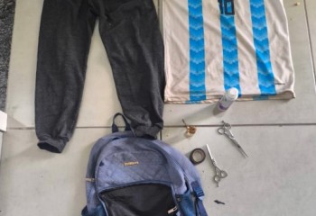 Durante a busca pessoal, nada de ilegal foi encontrado, mas na revista de sua mochila a polícia localizou um notebook cinza da marca Lenovo com carregador, uma caixa de som branca, duas tesouras, um desodorante, um rolo de fita isolante e um vidro de perfume para carro.