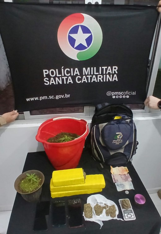 No local, as buscas resultaram na apreensão de porções adicionais de maconha, duas plantas da droga, uma balança de precisão, um esmurrugador e um celular. As casas, situadas no mesmo terreno, foram vistoriadas com o consentimento dos responsáveis.