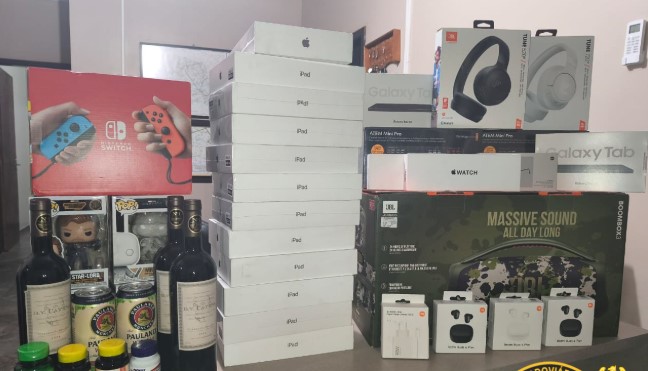 Diante da declaração, foi realizada buscas no veículo onde foram localizados aparelhos eletrônicos, 12 IPads da marca Apple, bebidas e outros eletrônicos, distribuídos em diversos locais do veículo, sem legalização aduaneira.