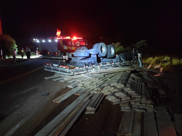 O caminhão estava carregado com madeira, tipo tábuas, e após o tombamento em curva o material ficou espalhado no acostamento da via. Os danos materiais foram de média monta.