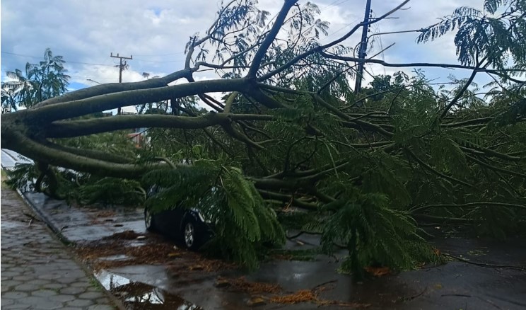 Um automóvel foi atingido por uma árvore no início da tarde deste sábado, dia 3, após ventos fortes serem registrados em São Lourenço do Oeste, no Oeste catarinense.