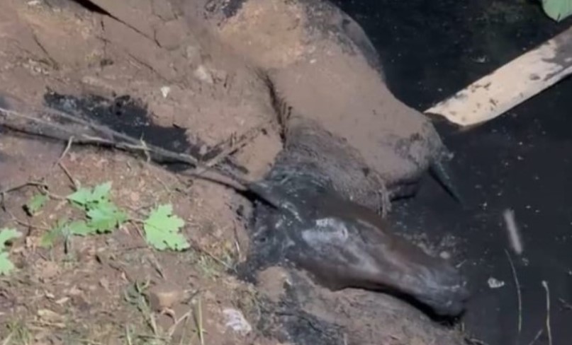 Animal estava submerso até o dorso em local com lama e esgoto.