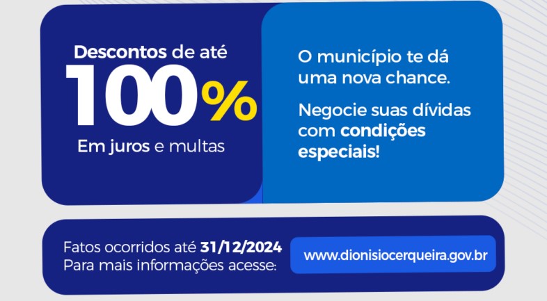 A Prefeitura Municipal de Dionísio Cerqueira iniciou oficialmente o REFI$ 2025, o Programa de Recuperação Fiscal que oferece aos cidadãos e empresas uma oportunidade única para regularizar dívidas pendentes junto ao município. Destinado a débitos cujos fatos geradores ocorreram até o dia 31 de dezembro de 2024, o programa foca na redução de encargos para facilitar a quitação de impostos e taxas, permitindo que o contribuinte recupere sua adimplência fiscal com condições facilitadas.