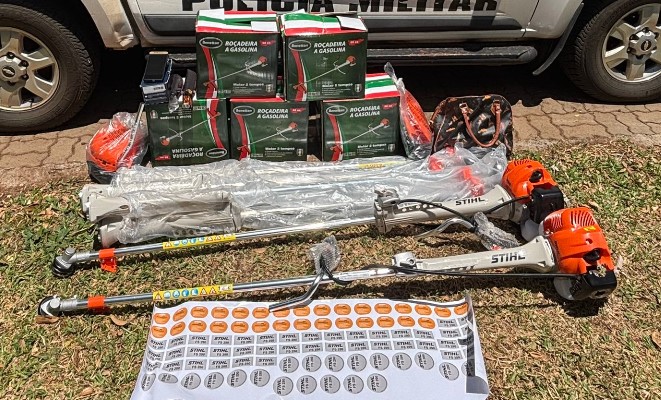 Diante da situação, a guarnição se deslocou até a residência do homem, localizada em São José do Cedro, onde foram localizadas mais cinco roçadeiras novas. No local, também foi apreendida uma sacola contendo diversos adesivos de diferentes marcas, o que caracterizou indícios de falsificação dos produtos.
